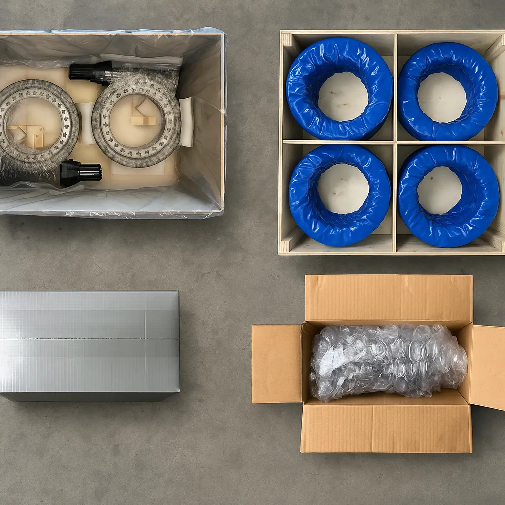 Slew rings, slew drives and hydraulic swivels are stacked in layers on wooden pallets or inside solid wooden boxes. Layers are cushioned with corrugated pad and foam roll. For wooden pallets, stacks are metal strapped, covered with foam roll and shrink wrapped to ensure the products are fully secured while in transit